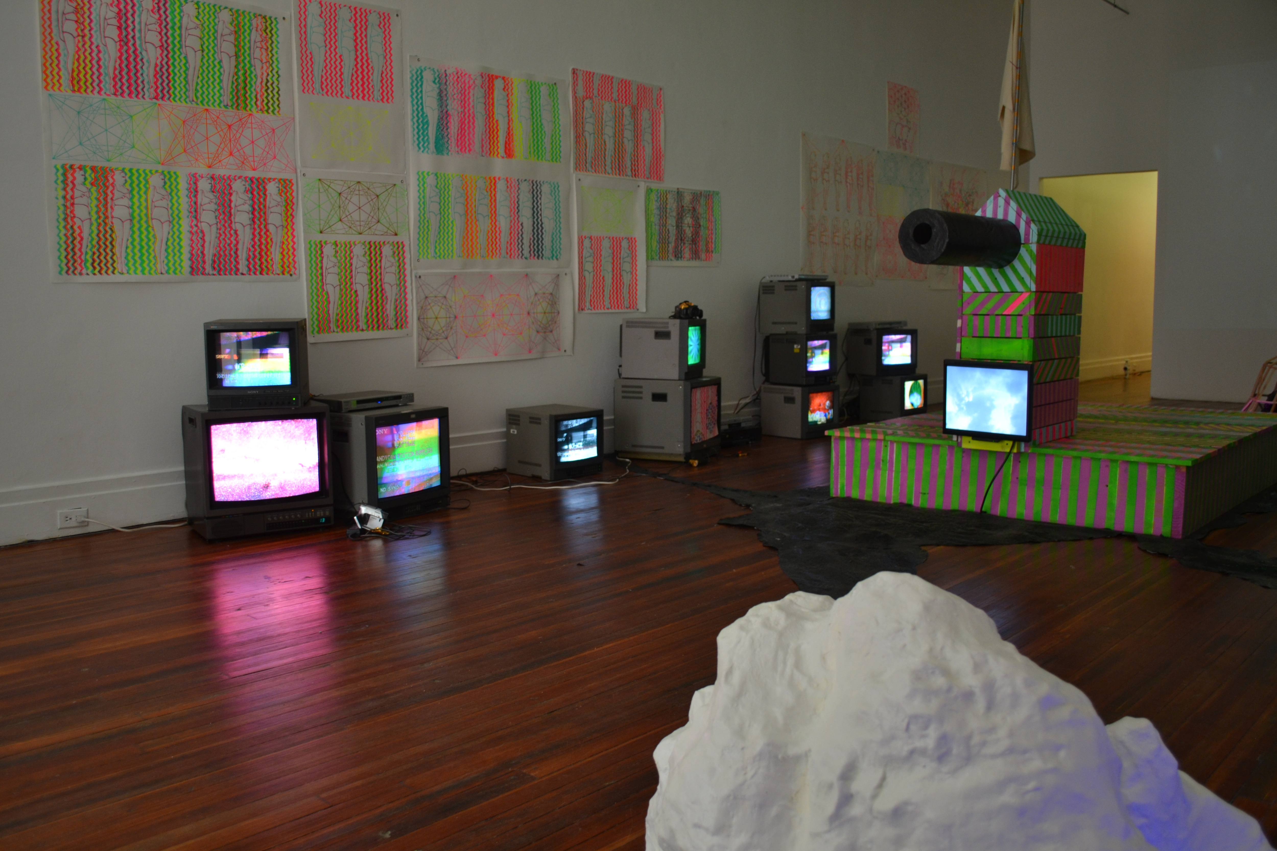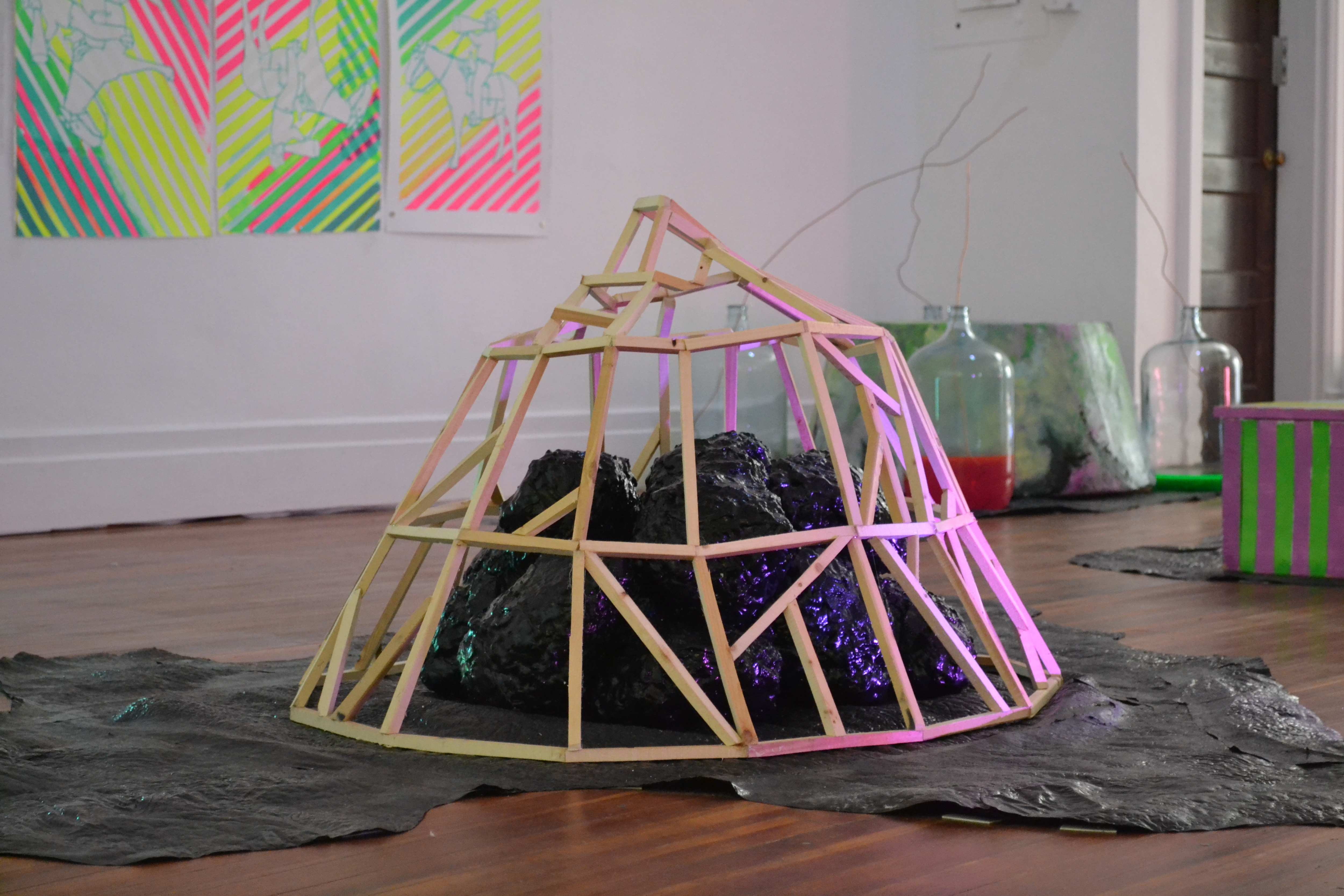 Celestial Mystic Spirits installation at Sediment Gallery, Richmond, VA. Video work By Matt Barton, 2d work Charlotte Rodenberg, & sculpture and performance Josh Rodenberg